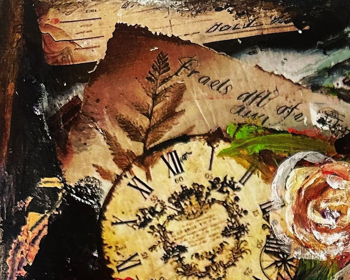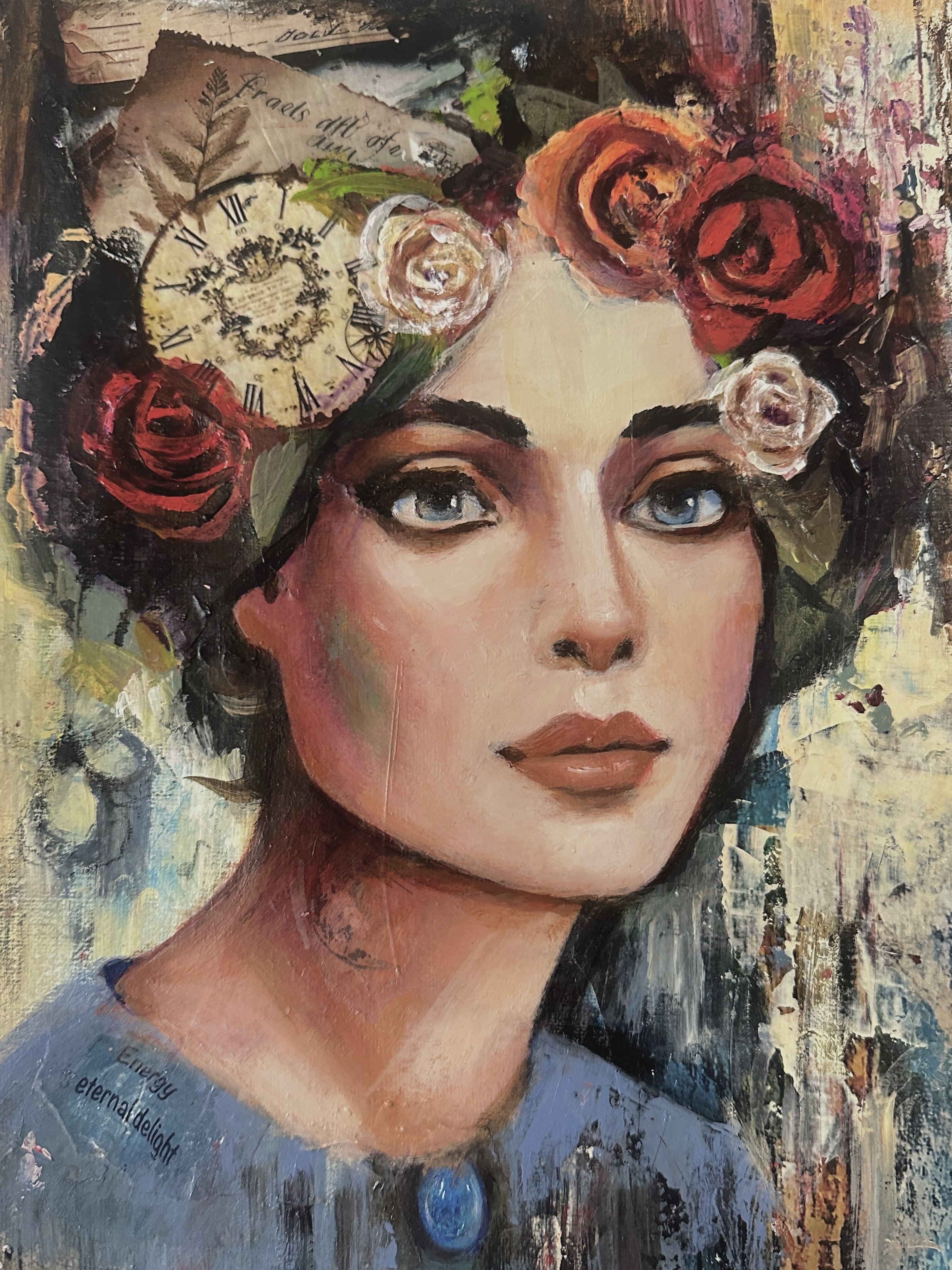 Adorned with vintage-inspired gears, flowers, clock motifs, and gold leaf this artwork evokes the passage of time and the beauty of transformation. The rich color palette of deep blues, burnt sienna, and warm umbers enhances the piece’s soulful expression, making it a stunning focal point in any space.